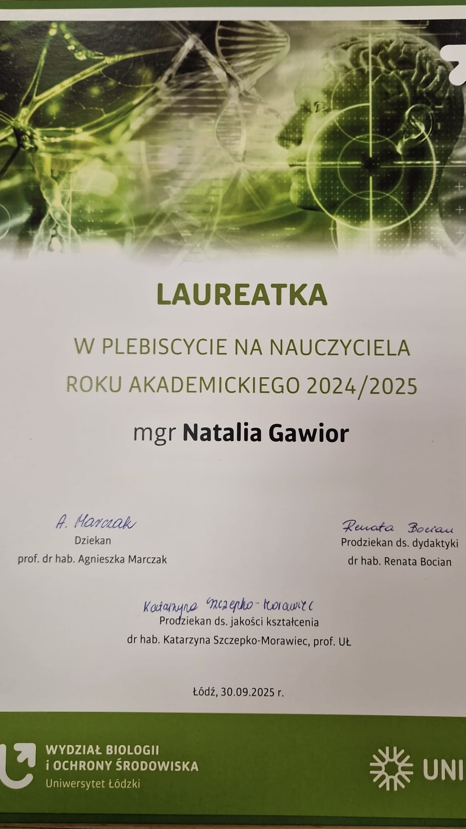 Mgr Natalia Gawior na Wydziale Biologii i Ochrony Środowiska naucza języka angielskiego specjalistycznego.